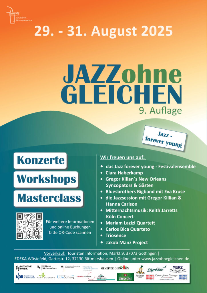 Jeder Mensch, der einmal von der Leidenschaft und dem Groove des Jazz erfasst worden ist, versteht, warum diese Musik uns so tief berührt. Das per se Dialogische im Jazz kann uns inspirieren, sich auf Begegnungen, auf neue Wege, auf Entdeckungsreisen einzulassen. Diese Eigenschaften beinhalten wichtige Impulse, um die nachwachsenden Generationen junger Jazzer*innen zu ermutigen, selbst kreative Wege zu wagen, Neues auszuprobieren, immer verwurzelt in der langen Tradition dieser Musik und dem zutiefst freien und humanen Geist des Jazz. Diesen Spirit wollen wir auch beim 9. JazzohneGleichen-Festival leben mit anregenden Konzerten, mit belebenden Erfahrungen und Begegnungen zwischen Musiker*innen und unserem begeisterungsfähigen Publikum. Auch in diesem Jahr möchten wir einen hohen Grad an aktiver Beteiligung für die Menschen in unserer Region ermöglichen. Dies gestalten wir insbesondere durch Workshops und Masterclasses, bei denen wir u.a. einen besonderen Schwerpunkt auf Kinder und Jugendliche legen. Beim Marchingkonzert mit den New Orleans Syncopators um Gregor Kilian werden Blasmusiker*innen aus der unmittelbaren Region einbezogen sein. In einem Symposium soll das Thema „Nachwuchsförderung im Jazz“ gemeinsam mit jungen Jazzer*innen beleuchtet werden